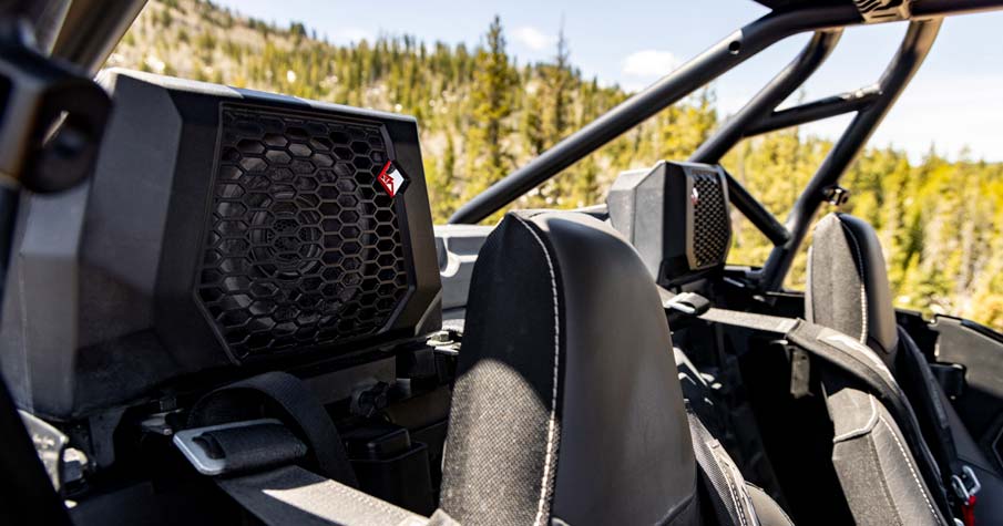 « Système audio Rockford Fosgate Stage 4 réglé et intégré en usine avec unité source RIDE COMMAND. Comprend (2) tweeters de 100 watts de 1 pouce, (2) haut-parleurs avant de 100 watts de 6,5 pouces, (2) haut-parleurs arrière coaxiaux de 100 watts de 6,5 pouces, (1) amplificateur de 400 watts à 4 canaux, et (1) subwoofer de 10 pouces avec amplificateur de subwoofer intégré de 400 watts. *Le système audio est testé en immersion dans l'eau IPX7 et IPX9K pour résister aux éléments humides.